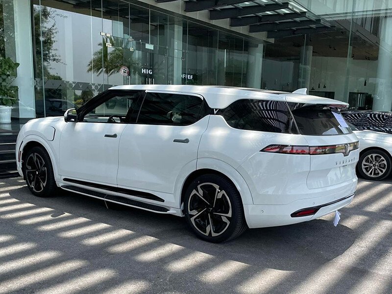 Ở phần thân xe VinFast VF9 có la zăng khủng hơn các đối thủ khi sở hữu bộ vành lớn 21 inch. VF9 còn có 1 chi tiết đáng chú ý khác là phần kính ở hông xe được tách làm đôi ở cột C bởi logo chữ “V” của VinFast.